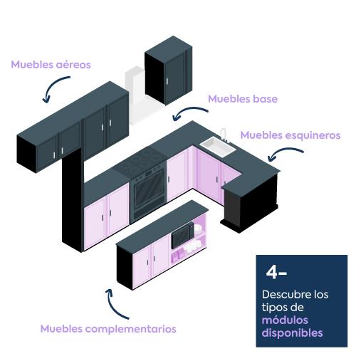 - Módulos esquineros: Especialmente diseñados para cocinas en L, optimizan el uso