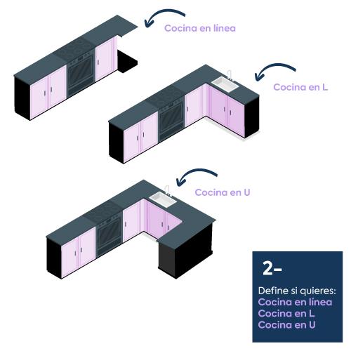El segundo paso para elegir tu cocina modular es decidir qué tipo de distribución se adapta mejor a tu espacio y estilo de vida: Existen 3: